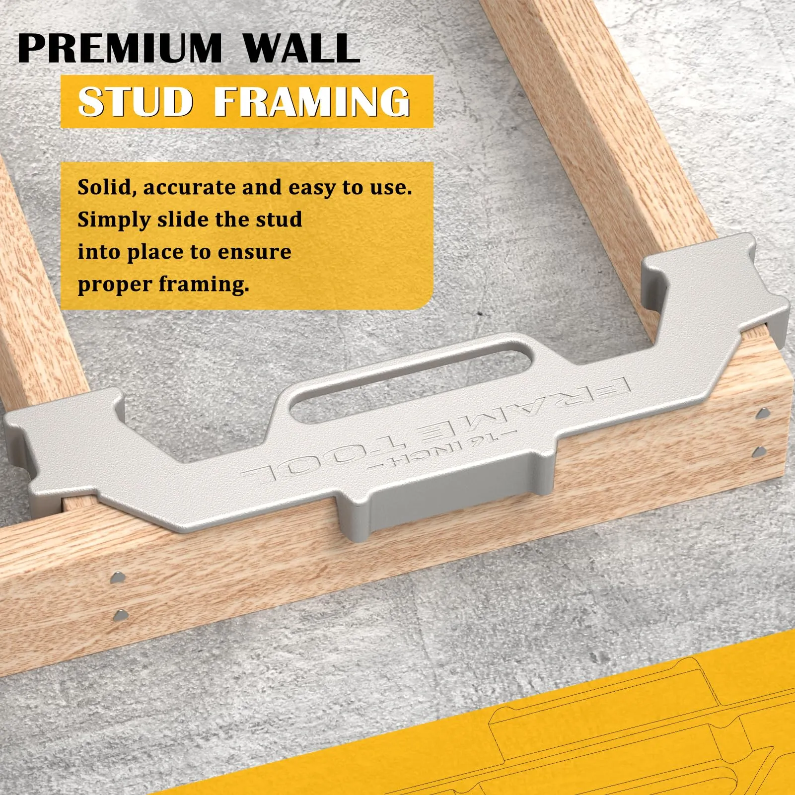 • 【Premium Wall Stud Framing Tool】 Solid, accurate and easy to use. Simply slide the stud into place to guarantee proper framing. It can help you quickly set up a very standard 16 inch spacing frame. This is especially helpful if you don't have the best helpers.
