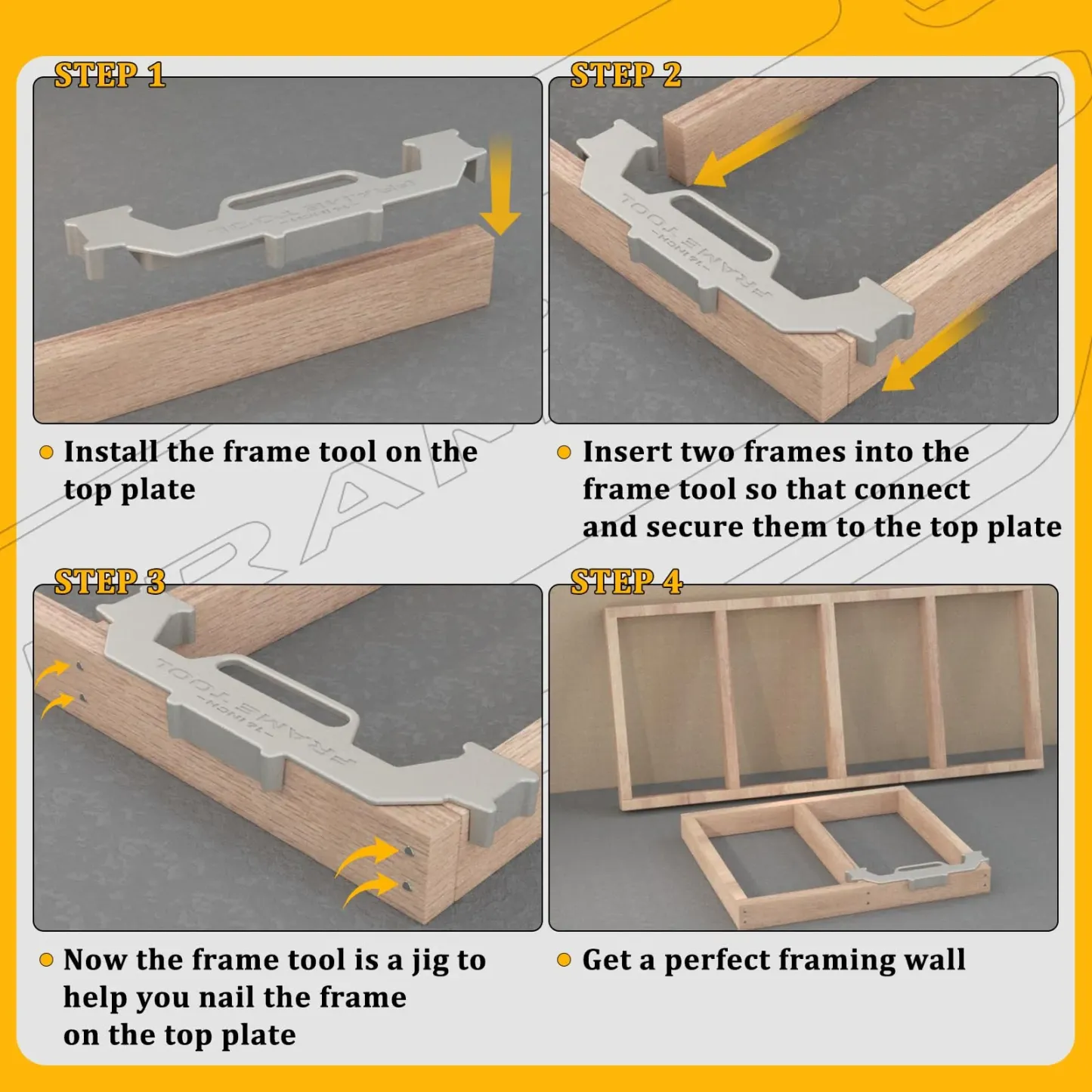• 【Easy To Use】The frame tool is a jig to help you nail the frame on the top plate.It can achieve a very standard state of parallelism or verticality between the wood, helping you build a very stable frame.
