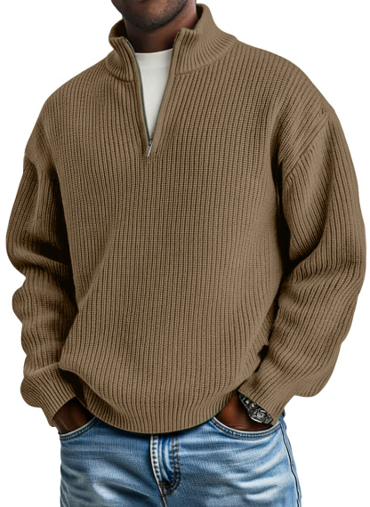Men's casual plain knitted loose zip-up stand-up collar pullover sweater